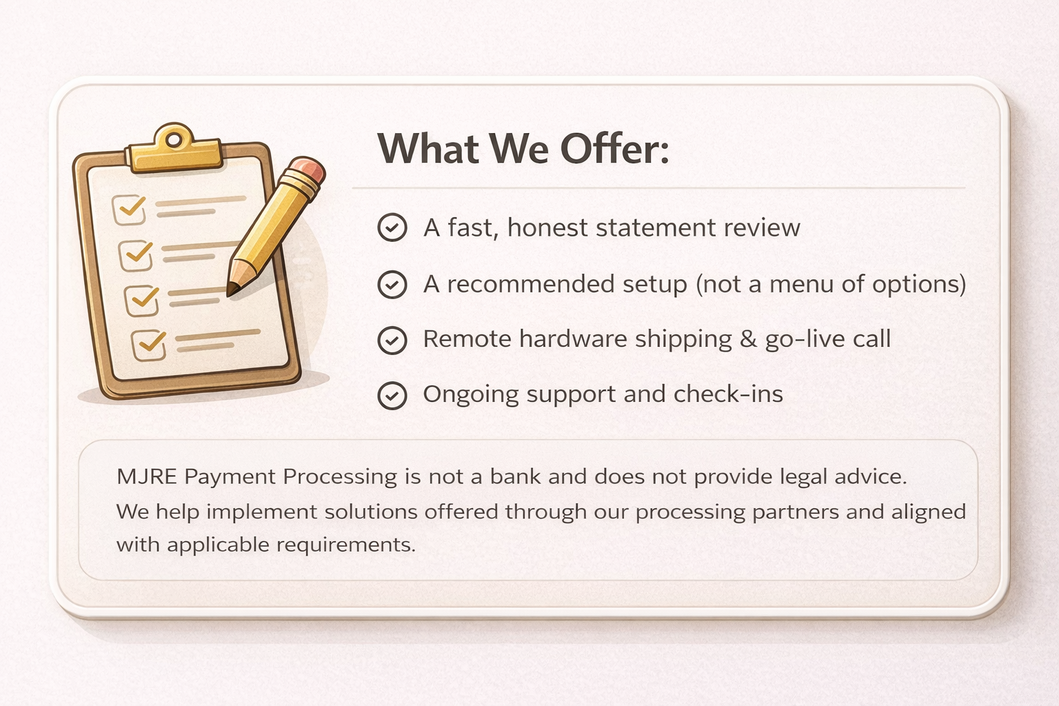 MJRE Payment Processing was built around a simple idea: business owners should understand how payments affect their bottom line—and have options that don’t require guessing.